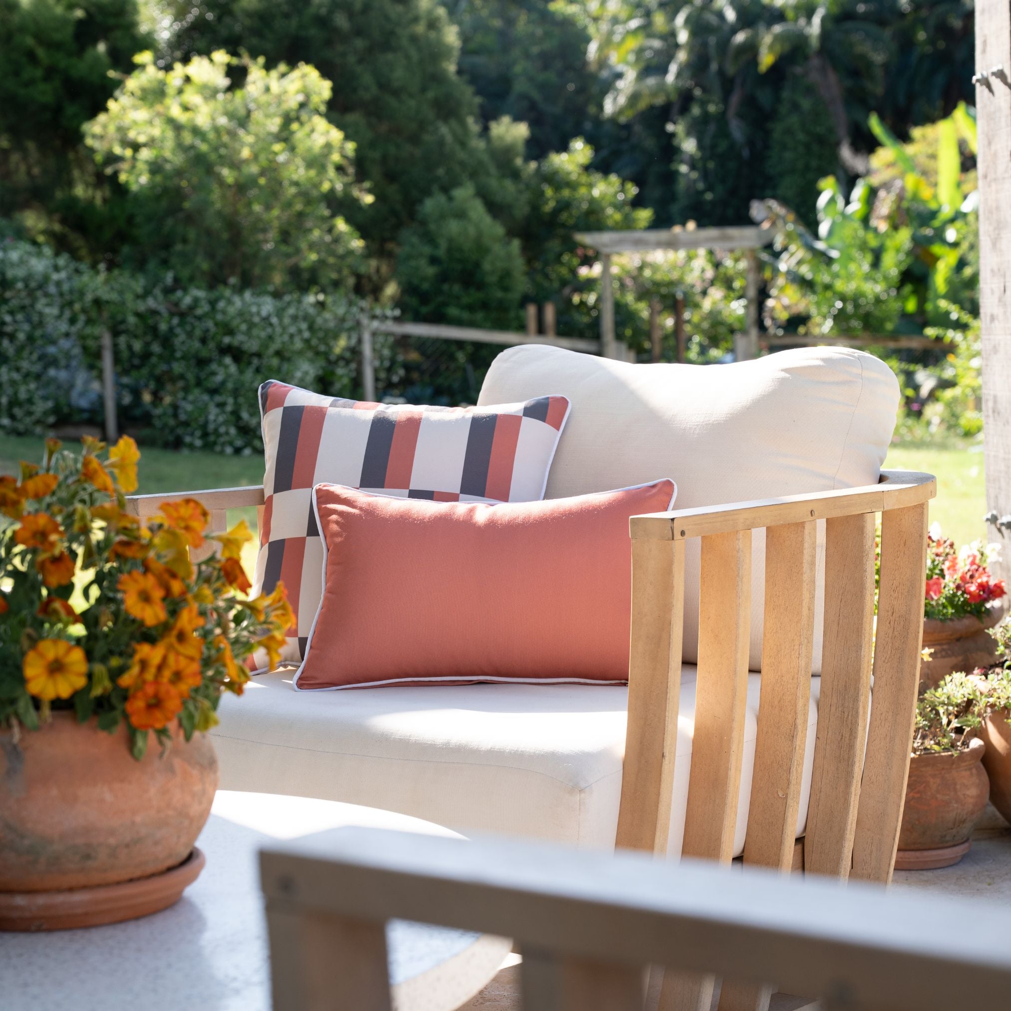 Each pillow is crafted from UV-treated fabric and filled with fast-dry foam to handle Australia’s changing conditions. The crisp white piping adds a tailored edge that feels refined yet relaxed — the perfect detail for any outdoor setting, from sun lounge to alfresco dining.