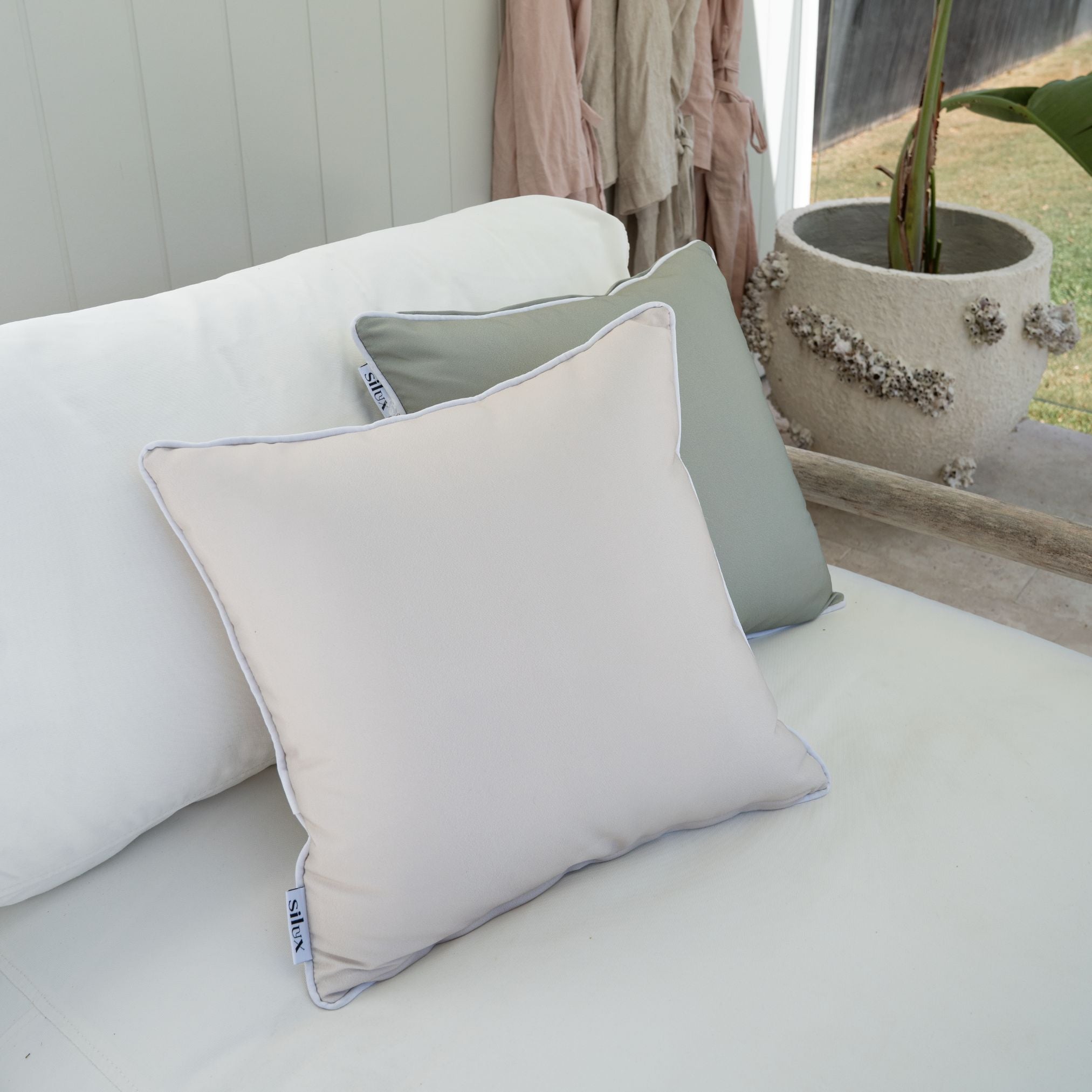Each pillow is crafted from UV-treated fabric and filled with fast-dry foam to handle Australia’s changing conditions. The crisp white piping adds a tailored edge that feels refined yet relaxed — the perfect detail for any outdoor setting, from sun lounge to alfresco dining.